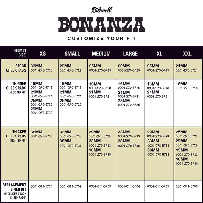We offer removable cheek pads for our US DOT-compliant Bonanza helmet so you can replace old, dirty ones or fine-tune comfort with a thinner or thicker set depending on your preference. Note: Since around model year 2020, Bonanza helmets have two snaps in each cheek pad to keep them from moving around. So, check your Bonanza to see if you have one or two snaps. (We do sell the old style single snap replacement cheek pads here.)
